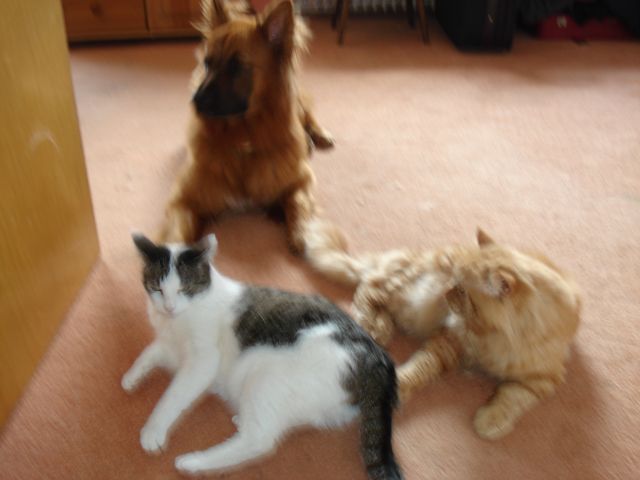 Mitunter dringt ein fremder Kater in das Revier meiner Hofkatzen ein und dann gibt es morgens so gegen vier die wüstesten Keilereien - direkt unter unserem Schlafzimmerfenster. Ich muß schon gestehen, daß ich dann den Hund rausschicke, für Ordnung sorgen. Er tut aber keiner Katze was, stürmt nur einmal kläffend über den Hof und der fremde freche Kater zieht ab. Restschlaf gerettet!